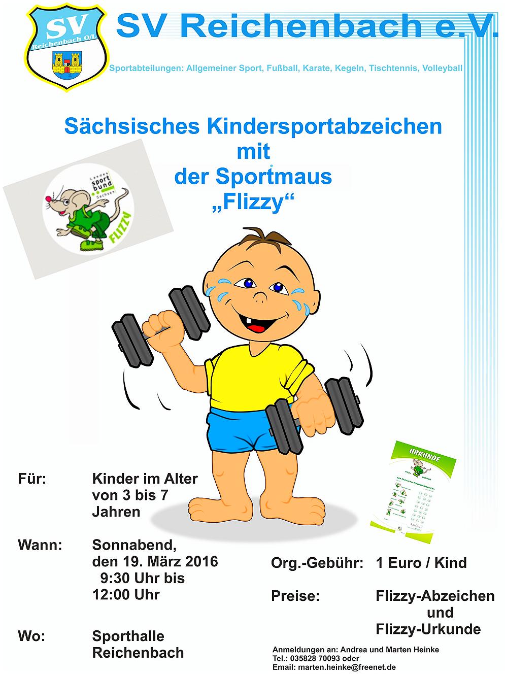 Bereits zum dritten Mal haben die drei- bis siebenjährigen Kinder die Möglichkeit am Samstag, den 19. März in der Zeit von 9:30 Uhr bis 12:00 Uhr das Sächsische Kindersportabzeichen mit der Sportmaus „Flizzy“ abzulegen. Das Ganze findet in der Sporthalle Reichenbach statt.