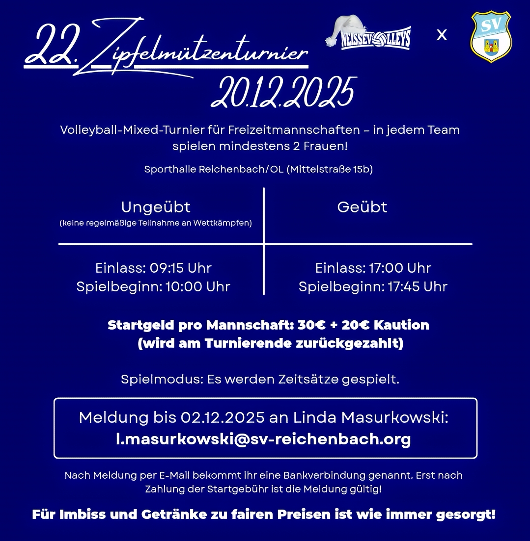 Packt eure Zipfelmützen ein, denn es ist wieder so weit: Das legendäre Volleyball-Mixed-Turnier für Hobby-Mannschaften steht vor der Tür! Und ja, wir bestehen darauf: Pro Team müssen mindestens 2 Damen ran. Fairness geht vor, auch wenn’s weihnachtlich wird!