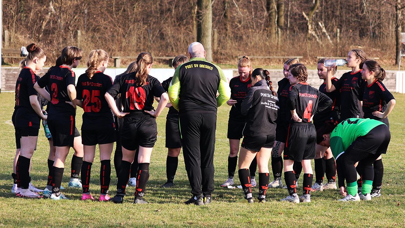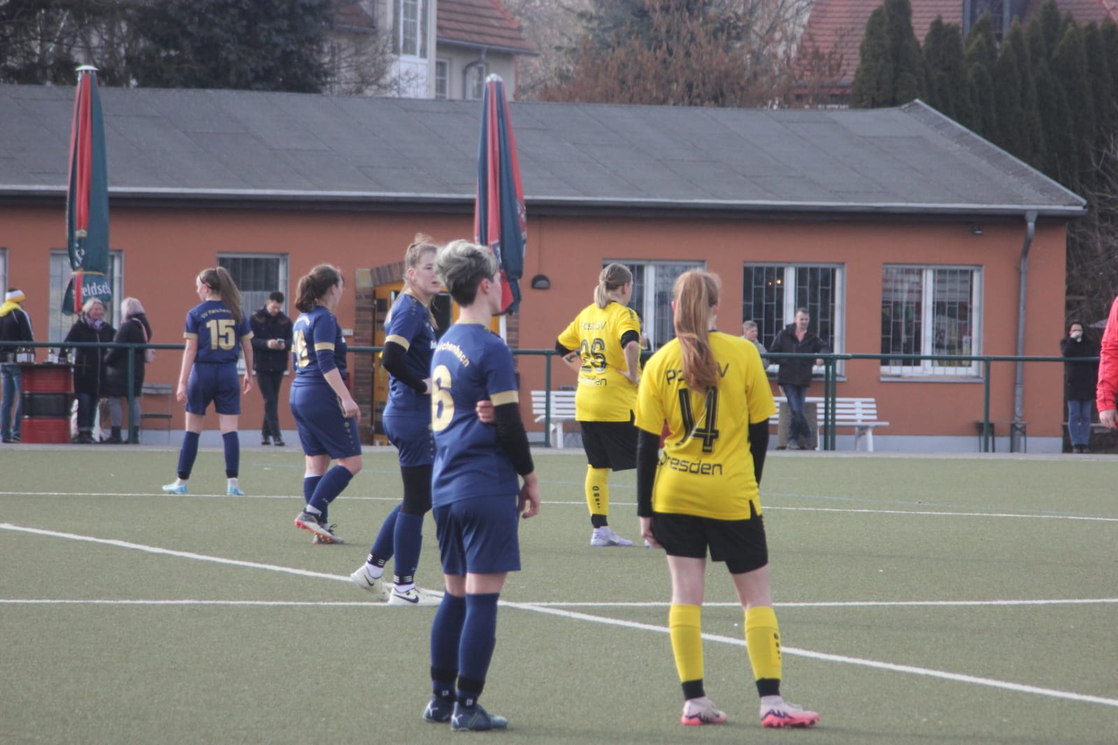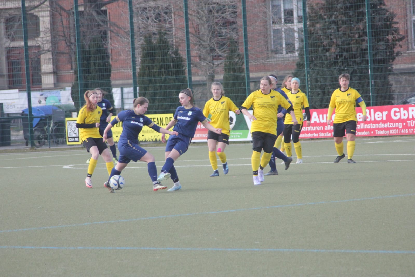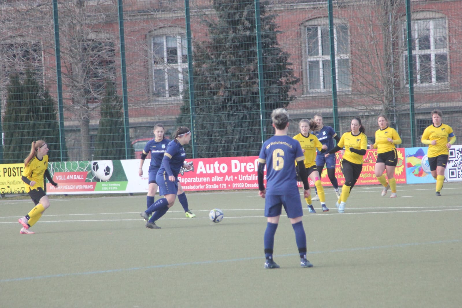 Pünktlich zum Startschuss der Freiluftsaison in 2025 ereilte die Mädels des SVR die Krankheitswelle, sodass man ziemlich gebeutelt die Reise nach Dresden auf sich nahm. Zum Freitagabend hatte man gar nur zehn Spielerinnen zur Verfügung. Neuzugang Carolin Marschke, eigentlich mitten im Prüfungsstress kam noch hinzu um vollzählig zu sein. Somit waren sämtliche Ideen den Bus zu parken oder Beton anzurühren überworfen. Weiß ja eh niemand was mit anzufangen. In den ersten zehn Minuten spielte die Mannschaft von Badermann und Kubitz noch zurückhaltend und begann daraufhin auch offensiv Nadelstiche zu setzen. So steckt Badermann sauber auf Bräuer durch, die aber ein einer starken Fußabwehr der Keeperin scheitert. Wenige Minuten später kann sich Bräuer durchtanken und unter Bedrängnis zentral vor dem Tor zum Abschluss kommen. Sie trifft aber nur Aluminium. Marschke ist aber gedankenschnell und versenkt die Kugel per volley in den Maschen. Sowas nennt man einen Einstand nach Maß! Wenige Minuten bringt ein Schnitzer in der Hintermannschaft eine große Chance für die Fußballerinnen der Post. Doch Koser vereitelt die Chance bravourös. Auf der Gegenseite fehlen Bräuer nach Pass von Otto nur Zentimeter um an der Keeperin vorbeizugehen. Infolge dessen gab es noch kleinere Chancen. Danach ging es in die Pause.