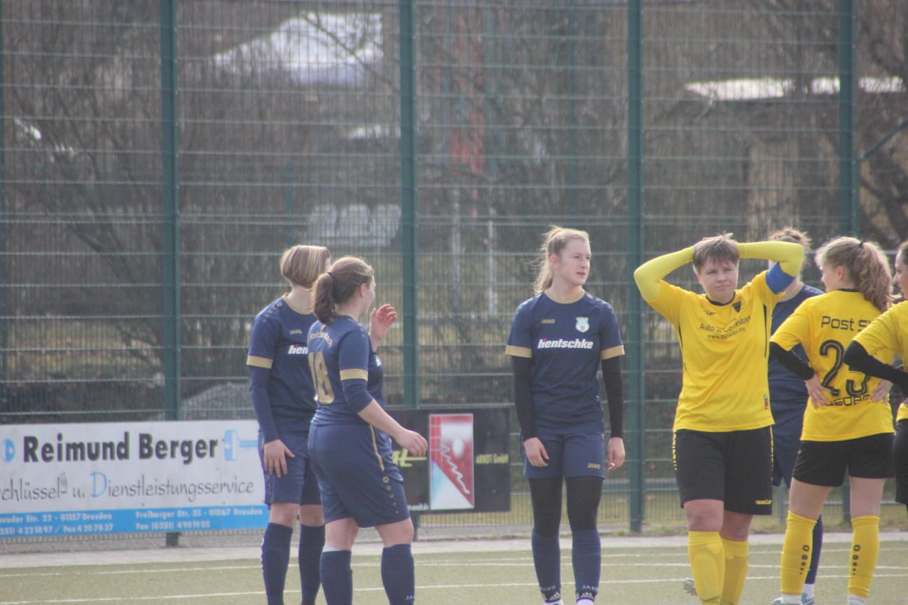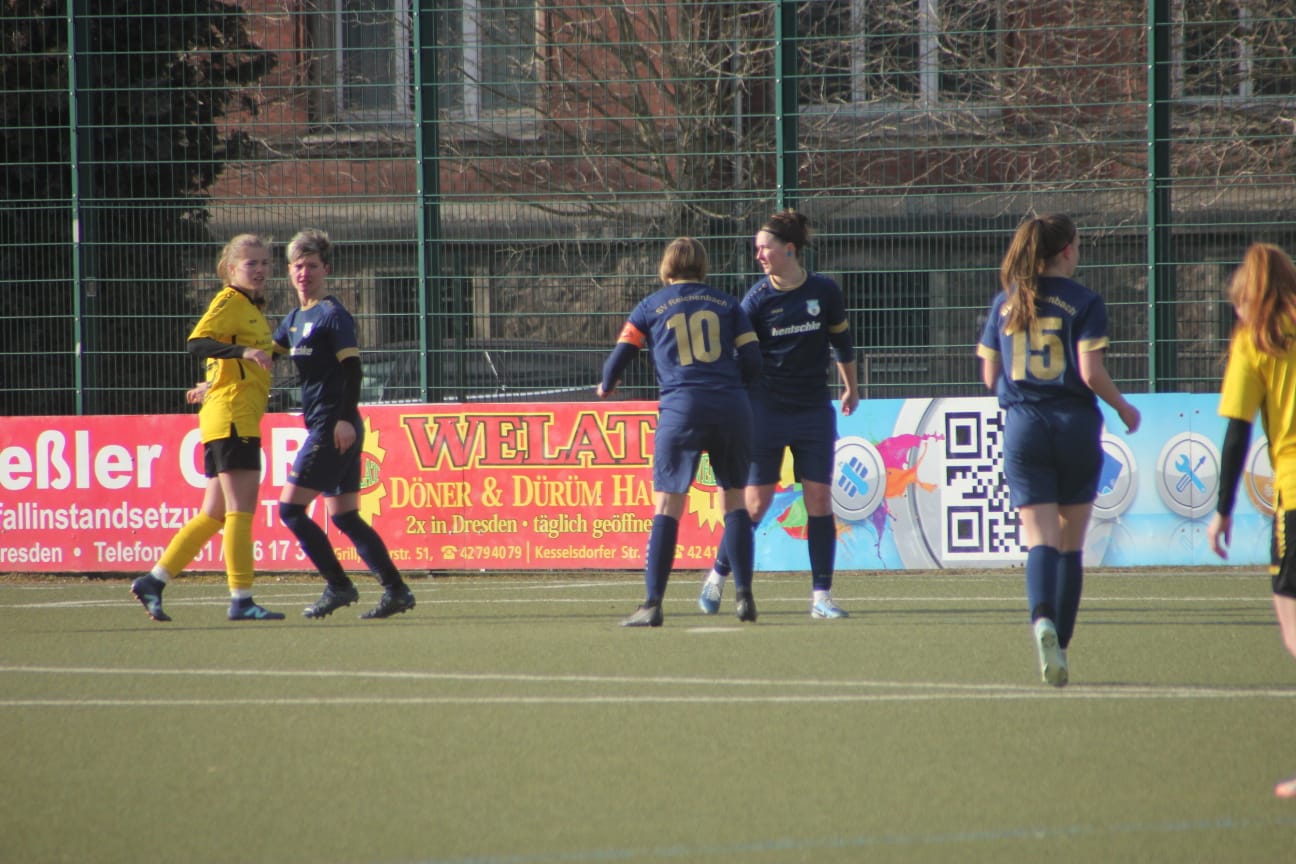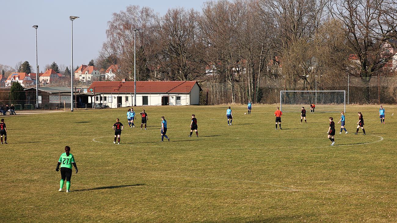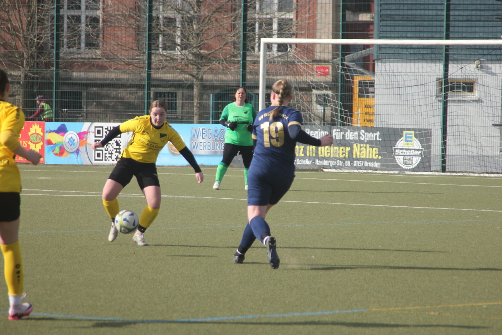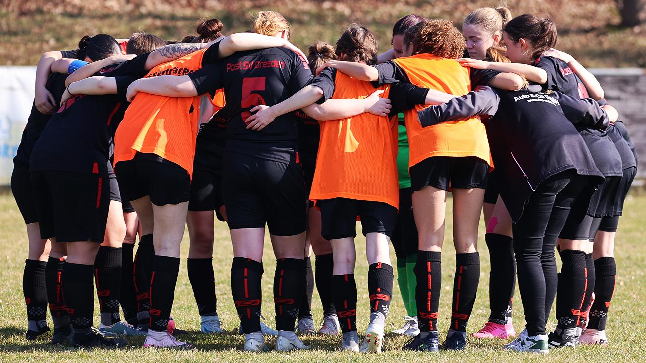 Pünktlich zum Startschuss der Freiluftsaison in 2025 ereilte die Mädels des SVR die Krankheitswelle, sodass man ziemlich gebeutelt die Reise nach Dresden auf sich nahm. Zum Freitagabend hatte man gar nur zehn Spielerinnen zur Verfügung. Neuzugang Carolin Marschke, eigentlich mitten im Prüfungsstress kam noch hinzu um vollzählig zu sein. Somit waren sämtliche Ideen den Bus zu parken oder Beton anzurühren überworfen. Weiß ja eh niemand was mit anzufangen. In den ersten zehn Minuten spielte die Mannschaft von Badermann und Kubitz noch zurückhaltend und begann daraufhin auch offensiv Nadelstiche zu setzen. So steckt Badermann sauber auf Bräuer durch, die aber ein einer starken Fußabwehr der Keeperin scheitert. Wenige Minuten später kann sich Bräuer durchtanken und unter Bedrängnis zentral vor dem Tor zum Abschluss kommen. Sie trifft aber nur Aluminium. Marschke ist aber gedankenschnell und versenkt die Kugel per volley in den Maschen. Sowas nennt man einen Einstand nach Maß! Wenige Minuten bringt ein Schnitzer in der Hintermannschaft eine große Chance für die Fußballerinnen der Post. Doch Koser vereitelt die Chance bravourös. Auf der Gegenseite fehlen Bräuer nach Pass von Otto nur Zentimeter um an der Keeperin vorbeizugehen. Infolge dessen gab es noch kleinere Chancen. Danach ging es in die Pause.